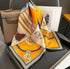 This DAYSWomen's Bohemian Square Scarf is a chic and vibrant accessory perfect for transitioning between seasons. The scarf features a soft imitation satin fabric that offers a luxurious, silk-like feel and drape. Its design showcases a sophisticated geometric print with equestrian-themed motifs, including stylized horses and carriages, set within a striking color block and patchwork pattern. The vibrant palette primarily consists of rich gold, sunny orange, beige, sky blue, and deep brown, all framed by a bold black border with contrasting stripes.