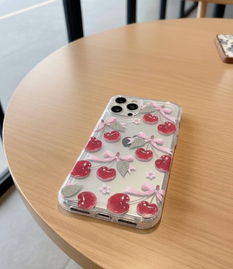 • Design: The back is decorated with multiple stylized, bright red cherries with short stems, as well as light grey leaves. The cherries are tied together with delicate, decorative pink ribbons and bows, giving the design a very cute, sweet, and feminine aesthetic. Small white or light pink flowers are also scattered throughout the pattern.